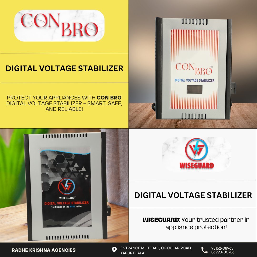 Protect your appliances with WISEGUARD & CON BRO Digital Voltage Stabilizers! Our advanced stabilizers continuously monitor and regulate voltage, safeguarding your electronics from fluctuations. Trusted by homes, offices, and businesses across Punjab.
